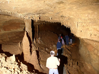 On the surface we typically visit sinkholes, losing streams, springs, and the Bear Cave entrance to the cave system. In the cave we walk along 2,100 feet of hard-surface cave trail and then retrace our route back to the shaft entrance. Two stops on the typical cave trip are at vertical shafts that receive recharge water from a sinkhole that is visited on the surface trip. Three stops are along the cave stream to discuss cave fauna and the water quality monitoring program that has been in operation since August 2002. The highly diverse cave fauna and actions to protect it are the focus of several stops on the cave trip. Depending upon the interests of the group a number of species living in the cave are pointed out as we travel the trail. This is a highly decorated cave and many interesting and beautiful speleothems (cave formations) are found along the trail.